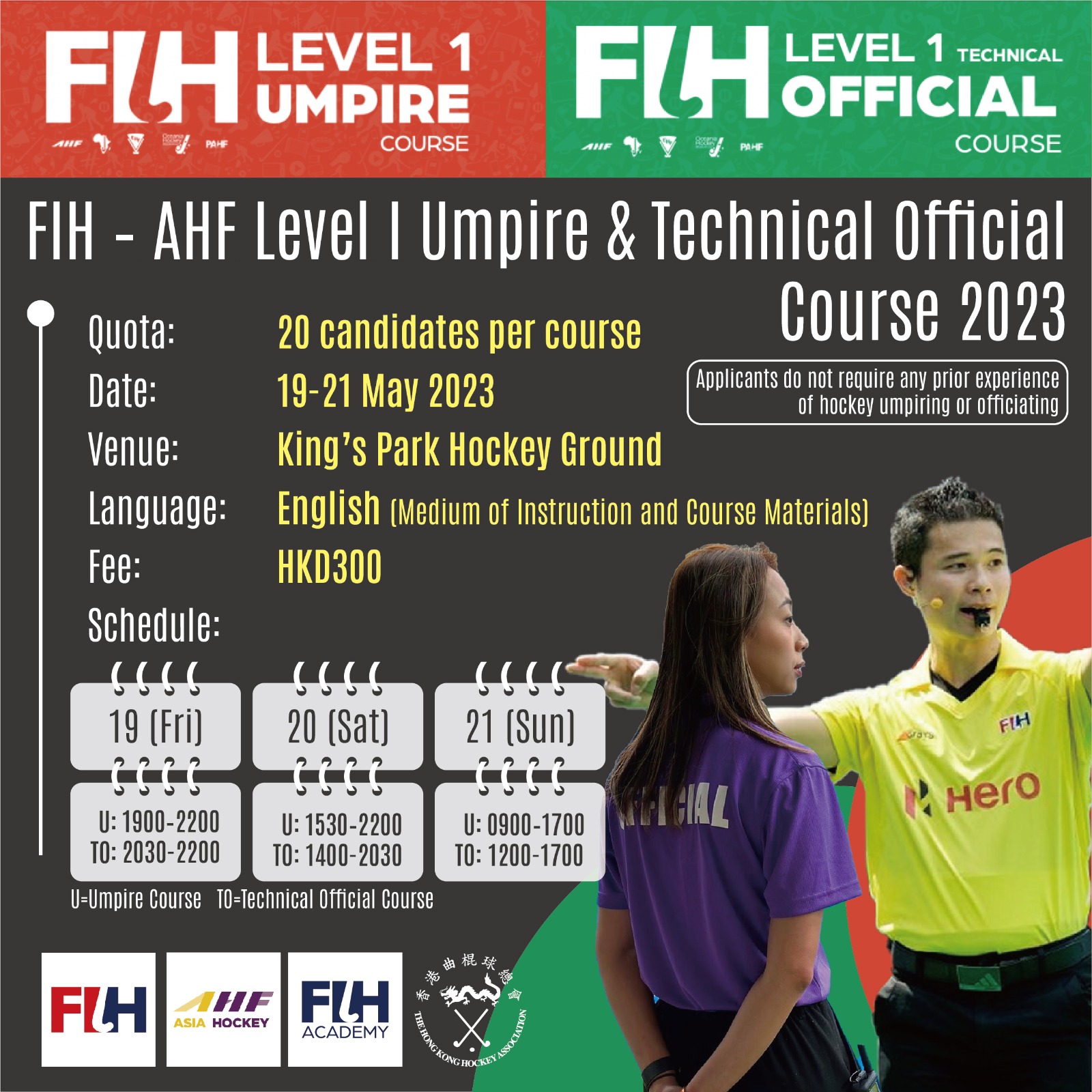 The Hong Kong Hockey Association will organize FIH - AHF Level 1 Technical Official Course and FIH - AHF Level 1 Umpire Course during 19-21 May 2023 in Hong Kong for individuals wanting to act as technical officials or umpires at initiation/beginner/foundation level. The courses will be interactive introductions to the skills and knowledge needed to become a hockey technical official or umpire. Details of the courses are as following: